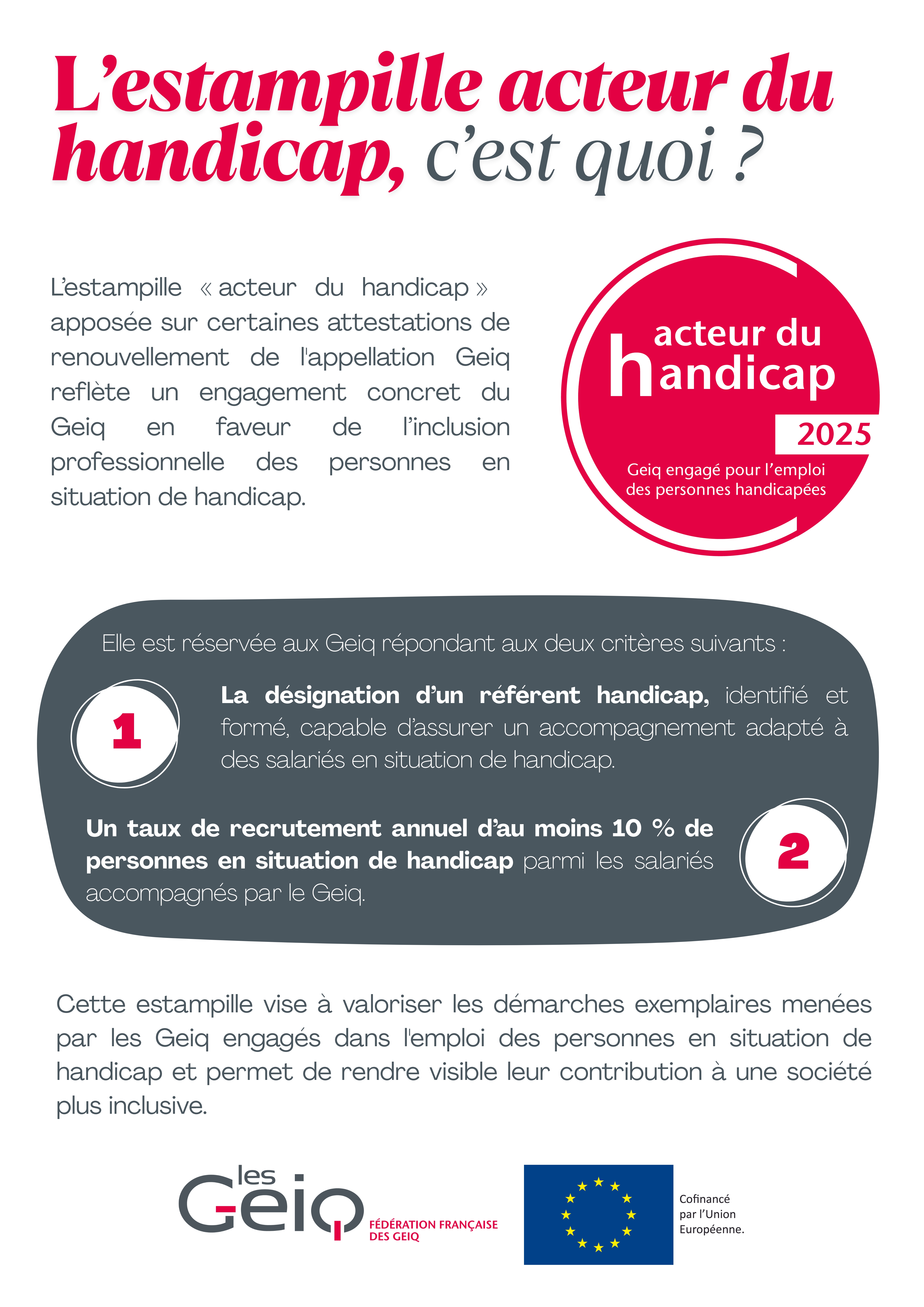 Depuis 2024, la Commission mixte nationale d’attribution de l’appellation Geiq a choisi de porter une attention particulière à l’insertion des travailleurs en situation de handicap au sein des Geiq. Ainsi, une estampille « Acteur du Handicap » est désormais délivrée aux Geiq répondant aux critères définis, et apposée sur leur attestation de labellisation.